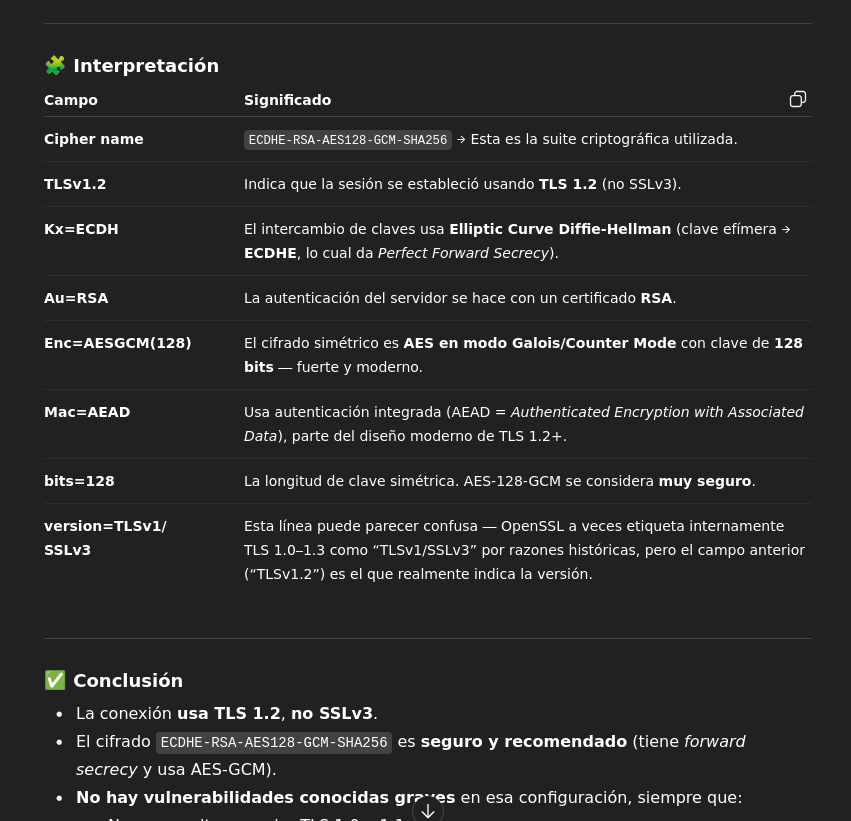 SSL: Cipher: name = ECDHE-RSA-AES128-GCM-SHA256; description = ECDHE-RSA-AES128-GCM-SHA256 TLSv1.2 Kx=ECDH Au=RSA Enc=AESGCM(128) Mac=AEAD